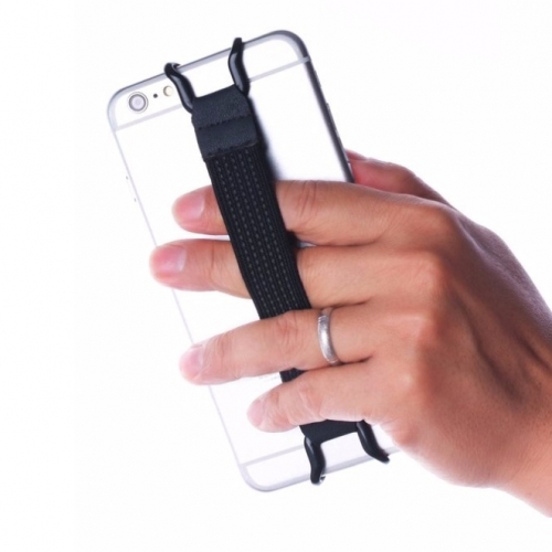 Plaats deze elastische houder om uw telefoon om deze met één hand te kunnen bedienen. De houder wordt om de telefoon bevestigd met twee haken die zijn voorzien van een zachte rubberen coating.